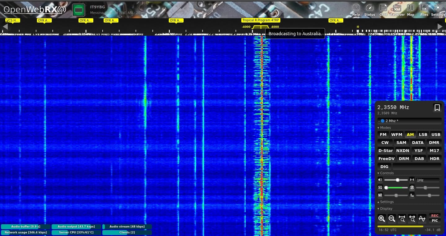 With summer approaching I modified my MLA30+ loop antenna to fit outside my summer QTH window. Unfortunately I can't install other more performing antennas. At the frequency of 2355 Khz, one afternoon in June, at 16:52 UTC (18:52 local) I received the radio station "Tropical R.Program 4TRP" from Australia, a great shot I would say! 😏